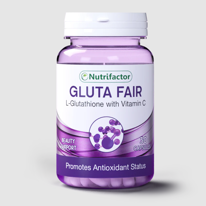 - Nutrifactor’s Gluta Fair contains L-glutathione and Vitamin C (ascorbic acid), both of these are strong antioxidants that help to reduce oxidative stress in body.
